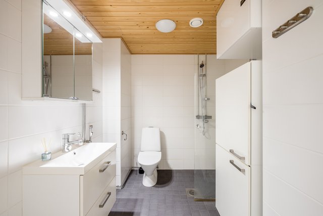 - Lattialämmitys, wc-istuin, suihku, suihkuseinä, pesukoneliitäntä, peilikaappi, pesuallas, allaskaappi, ja bidee-suihku