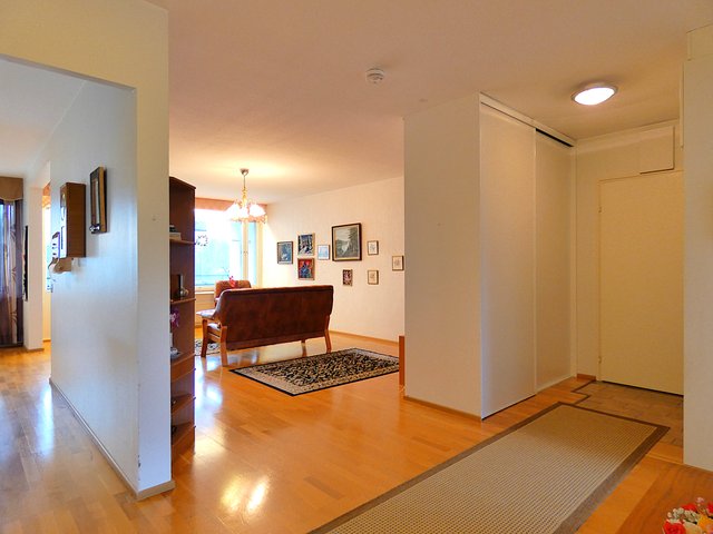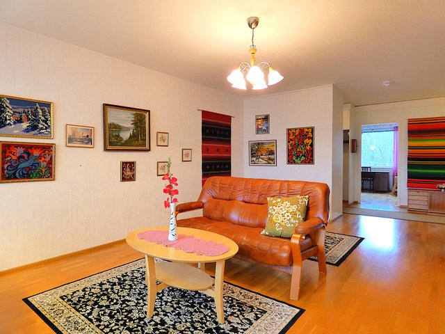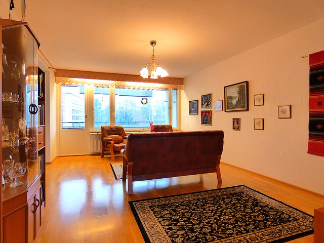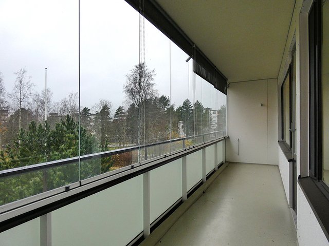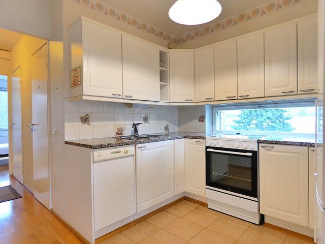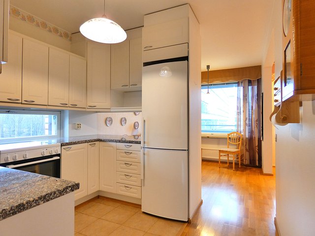 Siisti ja hyväkuntoinen huoneisto on remontoitu 2000-luvulla. Keittiössä on vaaleat kaapistot ja ruokailutilan puolelle mahtuu isompikin pöytäryhmä. Olohuone on iso ja valoisa. Molemmissa makuuhuoneissa on omat vaatehuoneet. Pesuhuoneessa on tyylikkäät kaakelit, samoin erillisessä wc:ssä. Lasitetulta parvekkeelta avautuu vehreä näkymä puistoon.