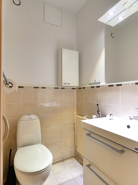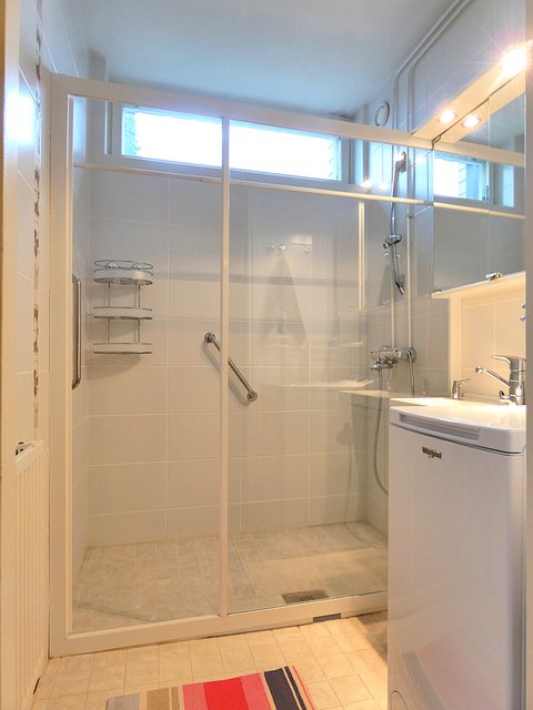 - Suihku, suihkuseinä, pesuallas, allaskaappi, pesukoneliitäntä, ja peilikaappi