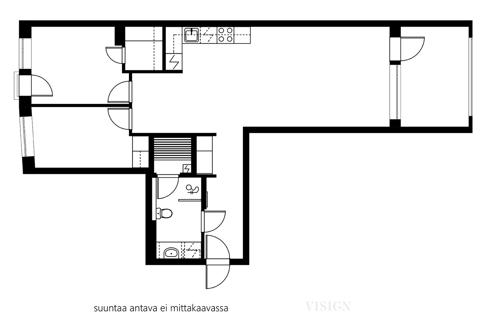 - Peilikaappi, suihkuseinä, allaskaappi, suihku, pesukoneliitäntä, lattialämmitys, wc-istuin, ja kiinteät valaisimet