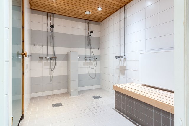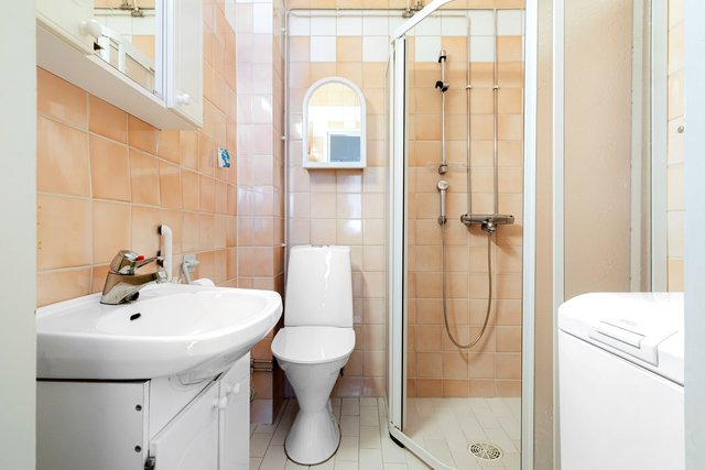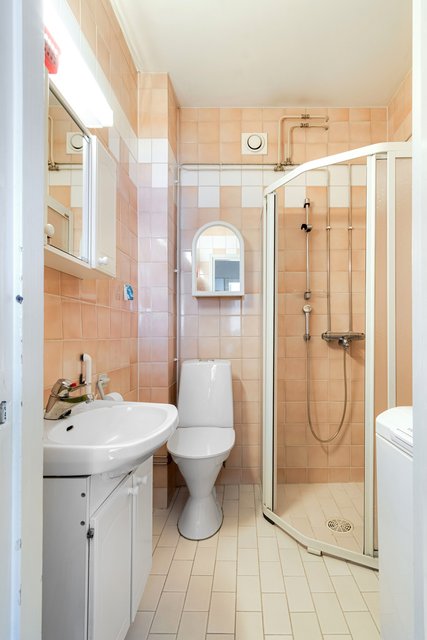 - Suihkukaappi, pesukoneliitäntä, wc-istuin, peilikaappi, suihku, ja allaskaappi