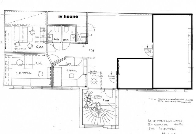 Pohjakerros on ollut aikaisemmin vuokrattuna kokous- ja saunatiloiksi.