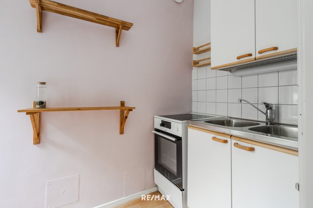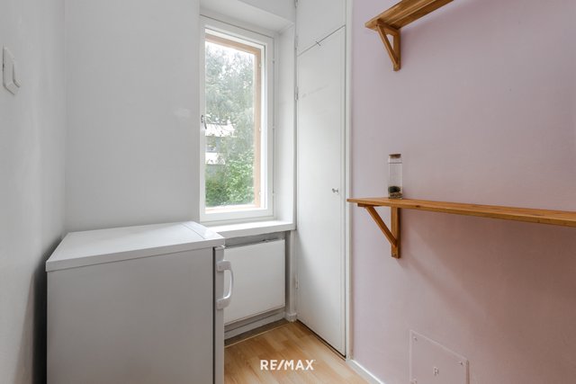 Olohuone ja makuuhuone ovat tilavia ja makuuhuoneessa säilytystilaa antaa vaatehuone. Keittokomerossa on keraaminen liesi ja ikkuna tuo viihtyvyyttä kokkailuun. Kylpyhuone on tilava ja siellä on paikka pyykinpesukoneelle.