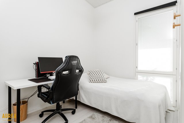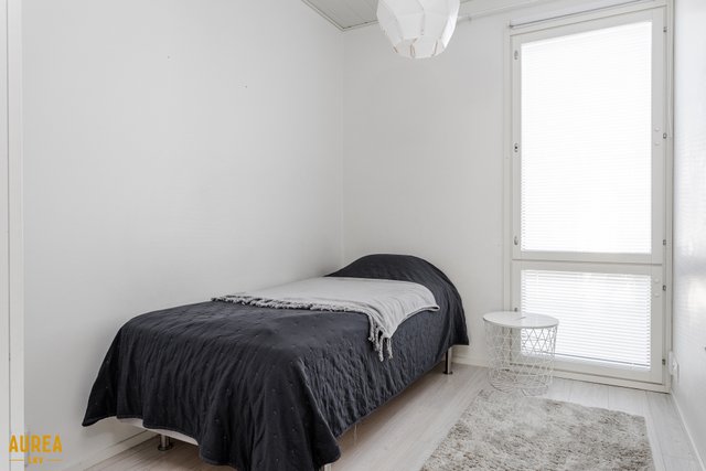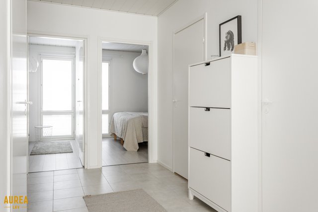 Kaksi makuuhuoneista sijaitsee eteisen yhteydessä, kolmas makuuhuone omalla vaatehuoneella on sijoitettu olohuoneen yhteyteen.
