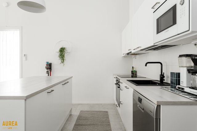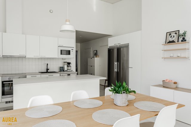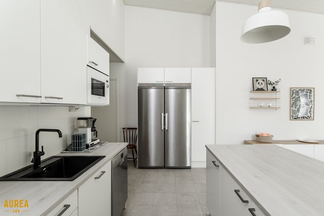 - Kaunis vaaleansävyinen keittiö rosterisilla kodinkoneilla.