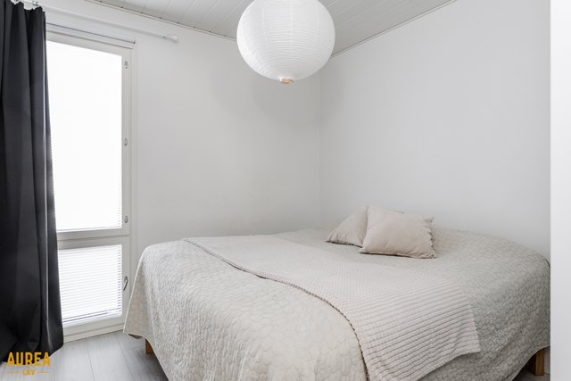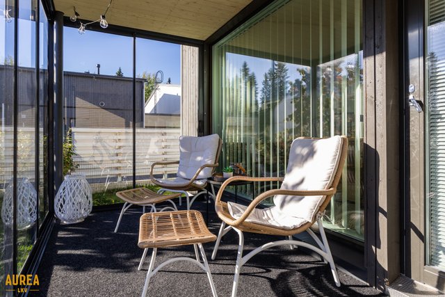- Olohuoneessa korotettu sisäkatto, ikkunoissa lamelliverhot.