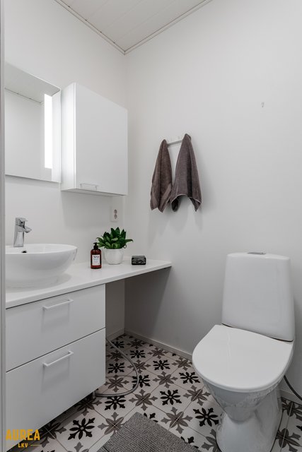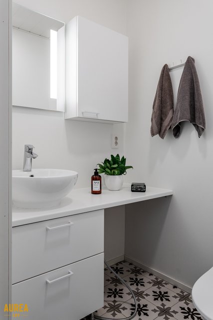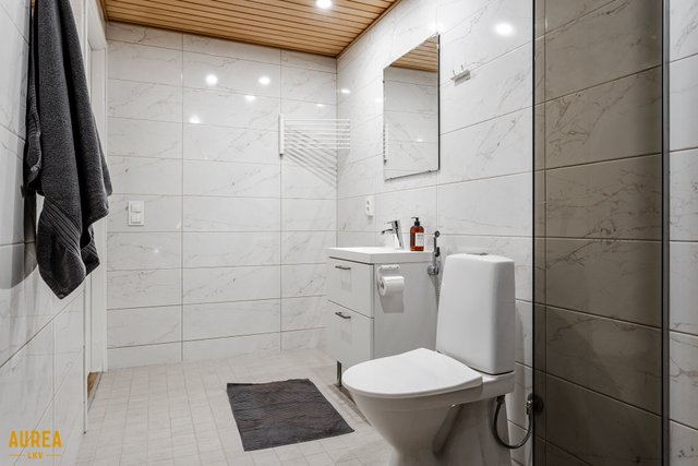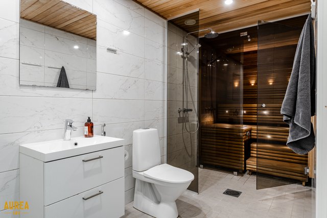 Kylpyhuone ja sauna muodostavat viihtyisän kokonaisuuden: saunassa on laadukkaat lämpökäsitellyt lauteet ja paneelit. Kodinhoitohuone on sijoitettu loistavasti omaksi tilaksi, jossa on hyvin kaappi- ja laskutilaa sekä paikka pyykinpesukoneelle ja kuivausrummulle. Lisäksi kodissa on kaksi wc:tä – erillinen wc sekä toinen kylpyhuoneen yhteydessä.