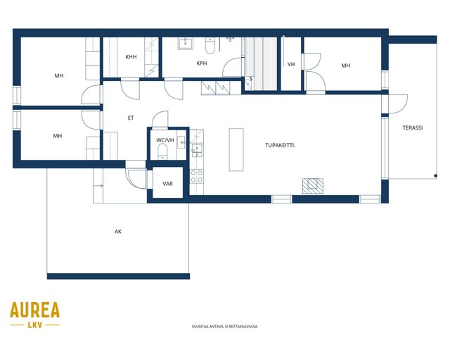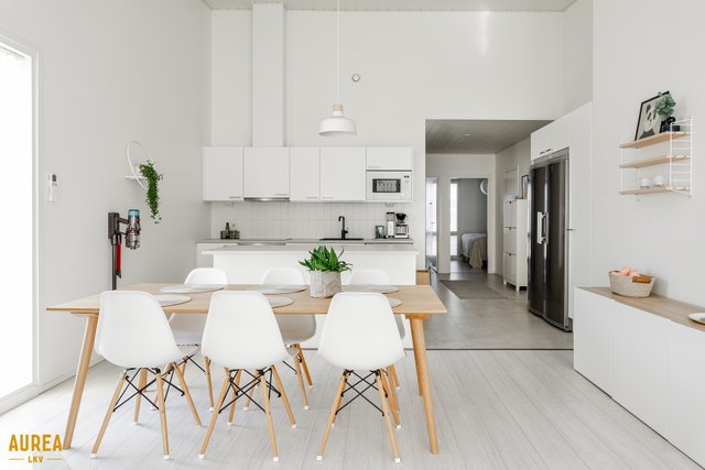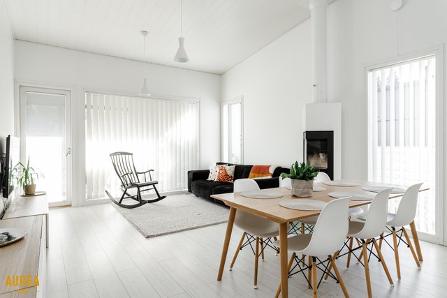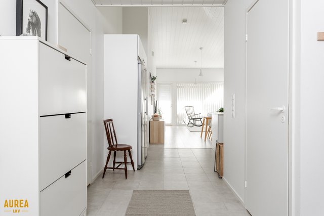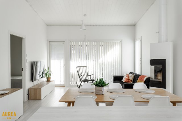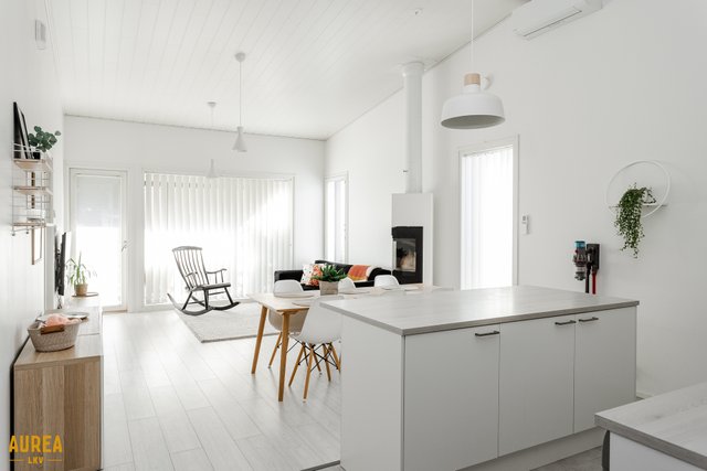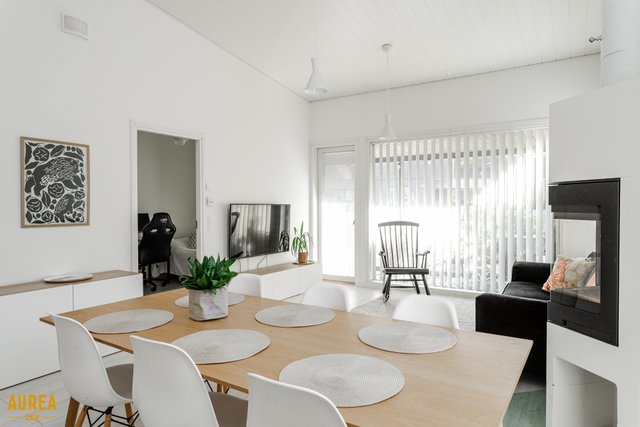 Kodissa on käytännöllinen ja avara pohjaratkaisu: valoisa olohuone-keittiöyhdistelmä viistokorotetulla sisäkatolla luo ilmavuutta, ja suuret ikkunat tuovat tilaan runsaasti luonnonvaloa. Keittiössä on hyvin kaappi- ja laskutilaa sekä laadukkaat kodinkoneet. Olohuoneen tunnelmaa täydentää tyylikäs takka.
