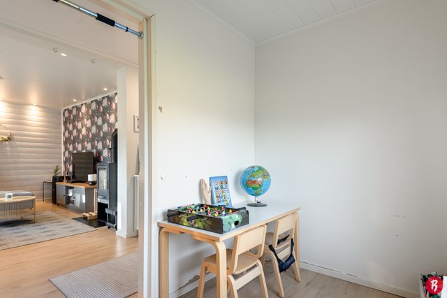 Työhuone sekä kaksi makuuhuonetta tarjoavat tilaa perheelle, ja olohuoneessa on tunnelmallinen takka, joka luo lämpöä ja kodikkuutta. Keittiö on varusteltu nykyaikaisilla laitteilla, mikä tekee ruoanlaitosta helppoa ja mukavaa. Alakerran kylpyhuoneessa on lattialämmitys, ja kellarikerroksessa on toinen kylpyhuone pesukoneliitännällä.