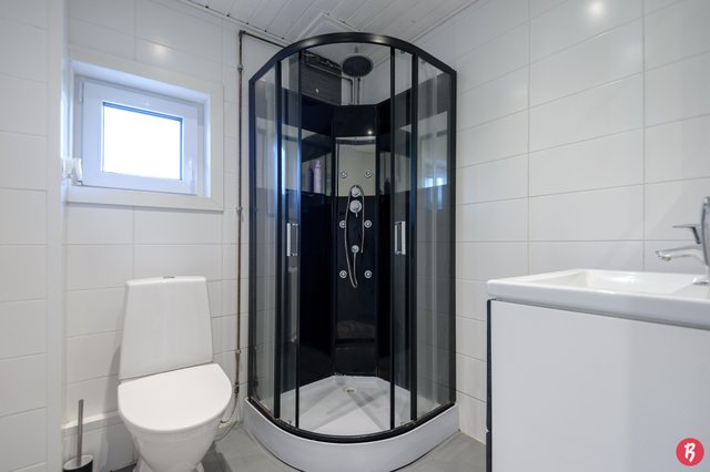 - Alakerran kph/wc: wc-istuin, suihkukaappi, pesuallas, allaskaappi ja lattialämmitys Kellaritilan kph: suihku ja pesukoneliitäntä
