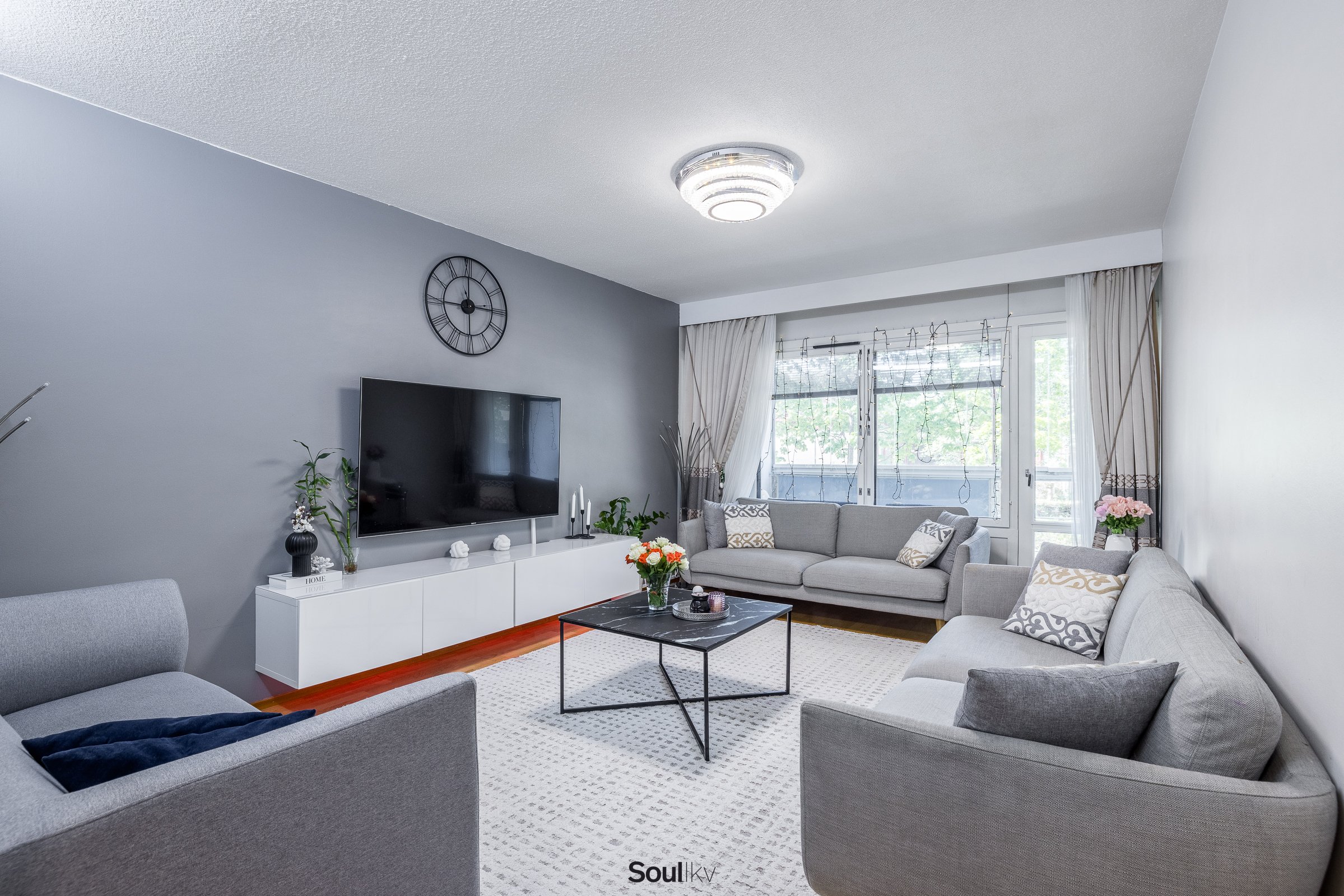 Olohuoneen tunnelma on rauhallinen ja valoisa, ja tila on helppo sisustaa mieleisekseen. Tilantuntua lisää lasitettu parveke, joka tarjoaa lisähuoneen aikaisesta keväästä pitkälle syksyyn. Molemmat makuuhuoneet ovat tilavia ja niissä on säilytystilaa kiintein kaapistoin. Kodin sävymaailma on rauhallinen ja helposti muunneltavissa omiin tarpeisiin. Tilava eteinen tarjoaa säilytysratkaisuja kaapistojen sekä erillisen vaatehuoneen muodossa.