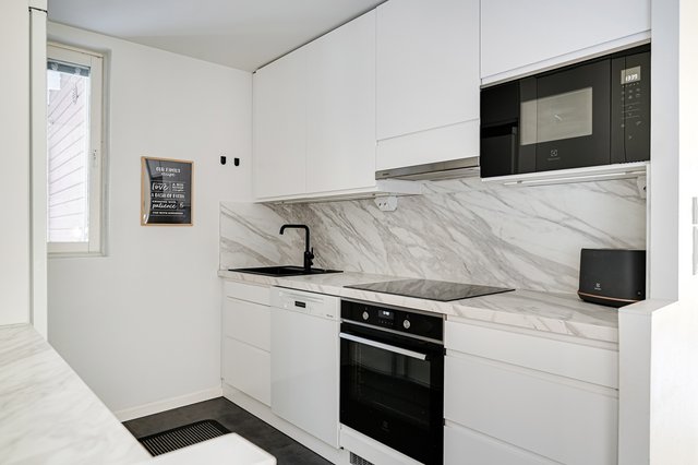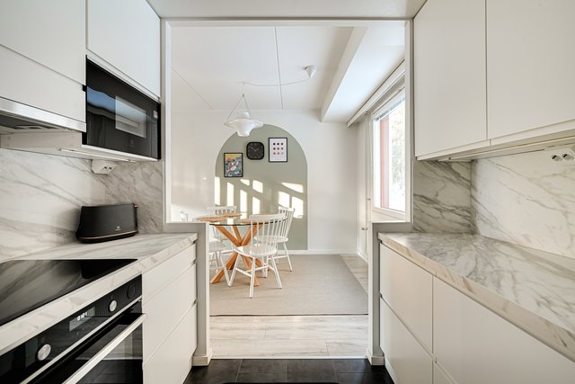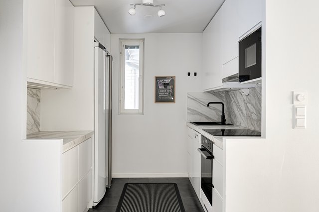 - Vuonna 2021 remontoitu vaaleasävyinen keittiö. Varusteet: kalusteisiin upotettu induktioliesitaso, erillisuuni (kiertoilma), liesituuletin, täyskorkea jääkaappi, täyskorkea pakastin, astianpesukone, integroitu mikroaaltouuni, musta komposiittiallas ja hana. Seinämateriaalit: Maali Lattiamateriaalit: Laatta Työtasot: Laminaatti