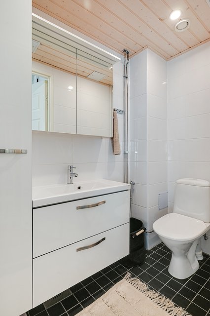 - Varusteet: WC-istuin, bideesuihku, suihku, lattialämmitys, pesukoneliitäntä (tilavaraus pesutornille), allaskaappi, pesuallas, peilikaappi ja taitettava suihkuseinä. Seinämateriaalit: Kaakeli. Lattiamateriaalit: Laatta.