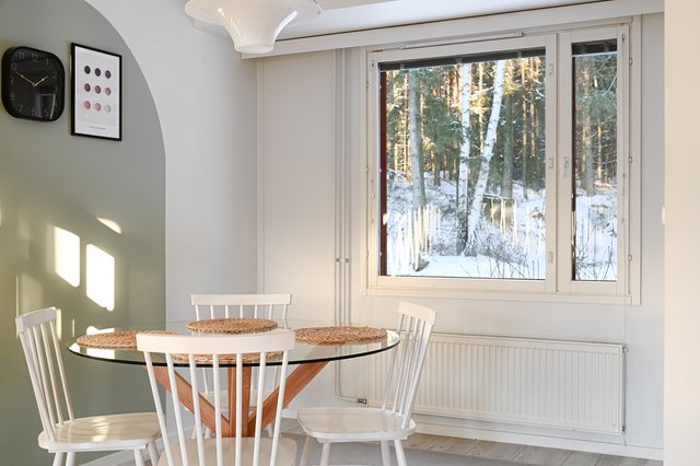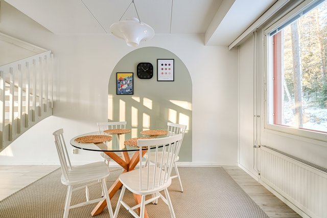 Ruokailutilaan mahtuu suuri ruokapöytä ja tila jatkuu ilmavana olohuoneeseen. Tilanjakajana toimii valkoinen portaikko. Ruokailutilan ikkunasta aukeaa rauhoittava, metsäinen maisema.