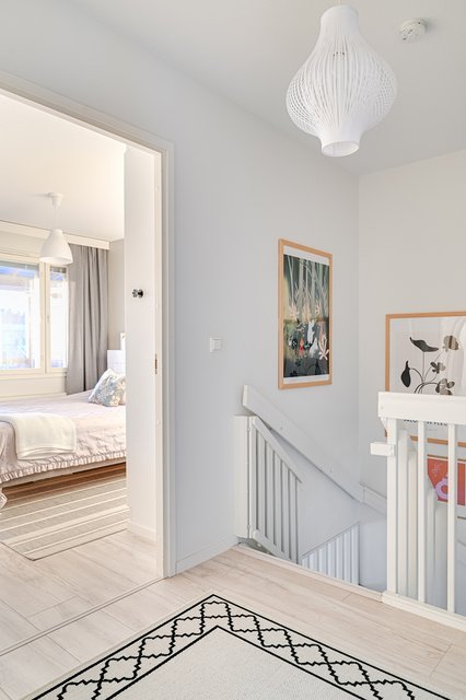 Yläkerrasta löytyy kolme makuuhuonetta, aulatila, parveke, vaatehuone, oma ikkunallinen sauna sekä kylpyhuone. Kaikissa makuuhuoneissa on kiinteät vaatekaapit. Myös yläkertaan on tuotu vaaleat, harmoniset värisävyt ja lattioihin katsetta ja käyttöä kestävä laminaatti.