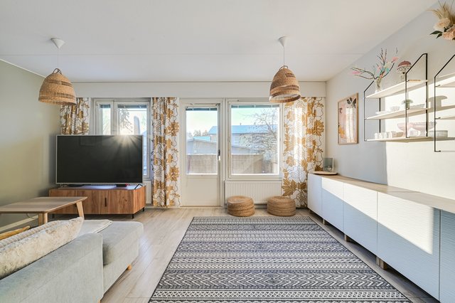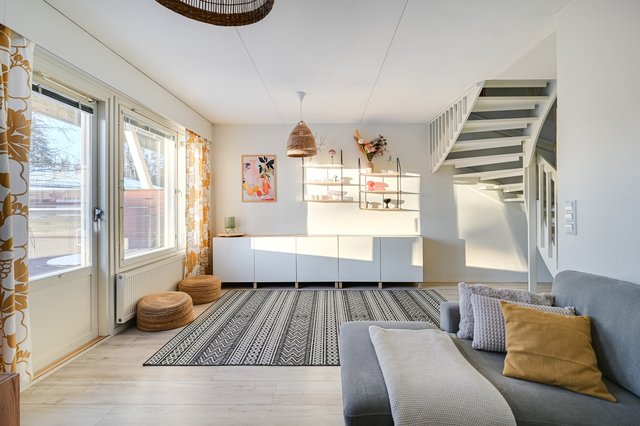 Avarasta olohuoneesta on käynti takapihan valtavalle, aurinkoiselle terassille. Hyväkuntoisella, hiljattain laajennetulla terassilla on tilaa niin grillailulle, lasten leikeille kuin oleskelullekin. Taloyhtiön pihalla on myös lapsille viihtyisä leikkipaikka.