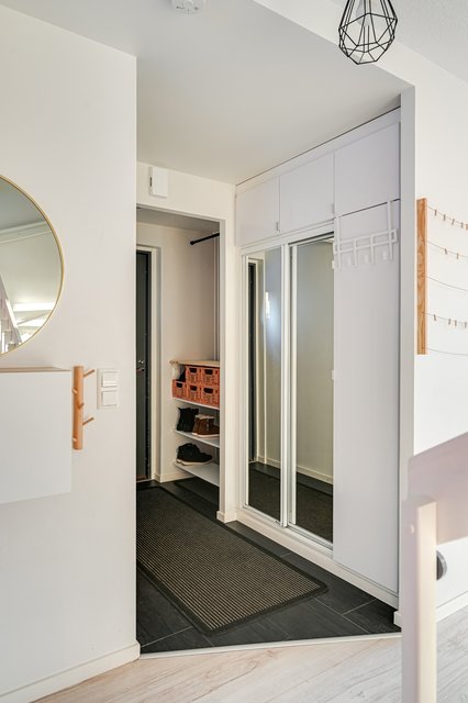 Eteiseen on valittu laattalattia ja vaatteille sekä kengille löytyy eteisestä hyvät säilytystilat.