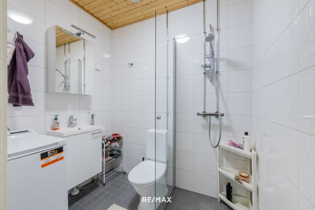 - WC-istuin, suihku, suihkuseinä, pesukoneliitäntä, allaskaappi, pesuallas, peilikaappi, bidee-suihku, ja lattialämmitys