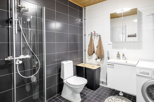 - WC-istuin, suihku, suihkuseinä, lattialämmitys, peilikaappi, allaskaappi, bidee-suihku, pesukoneliitäntä, ja kaappi