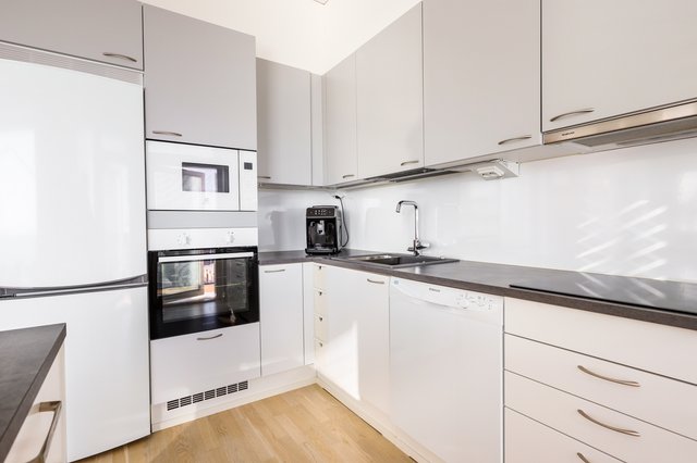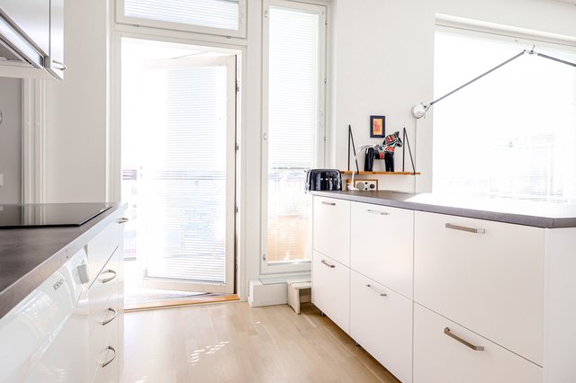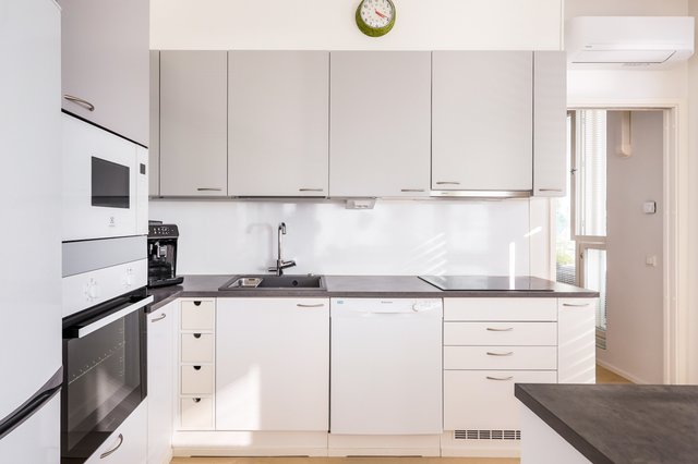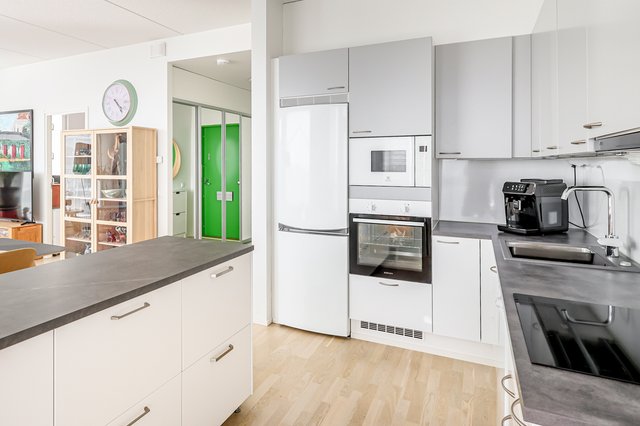 - Jääkaappipakastin, liesituuletin, mikroaaltouuni, keittiösaareke, uuni (kiertoilma), liesi, ja astianpesukone