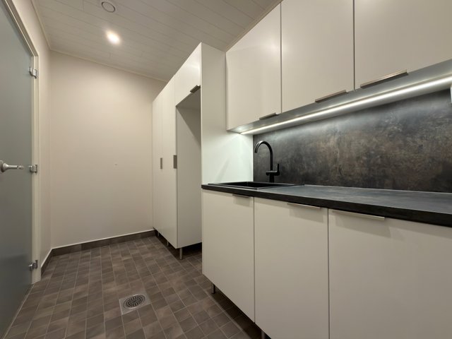 - Pöytätaso, lattialämmitys, pesukoneliitäntä, pyykkikaapit, ja pesuallas