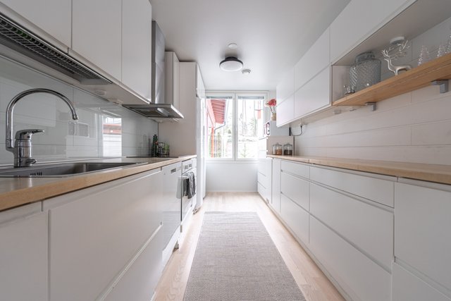 - Pesukoneliitäntä, pyykkikaapit, ja pöytätaso