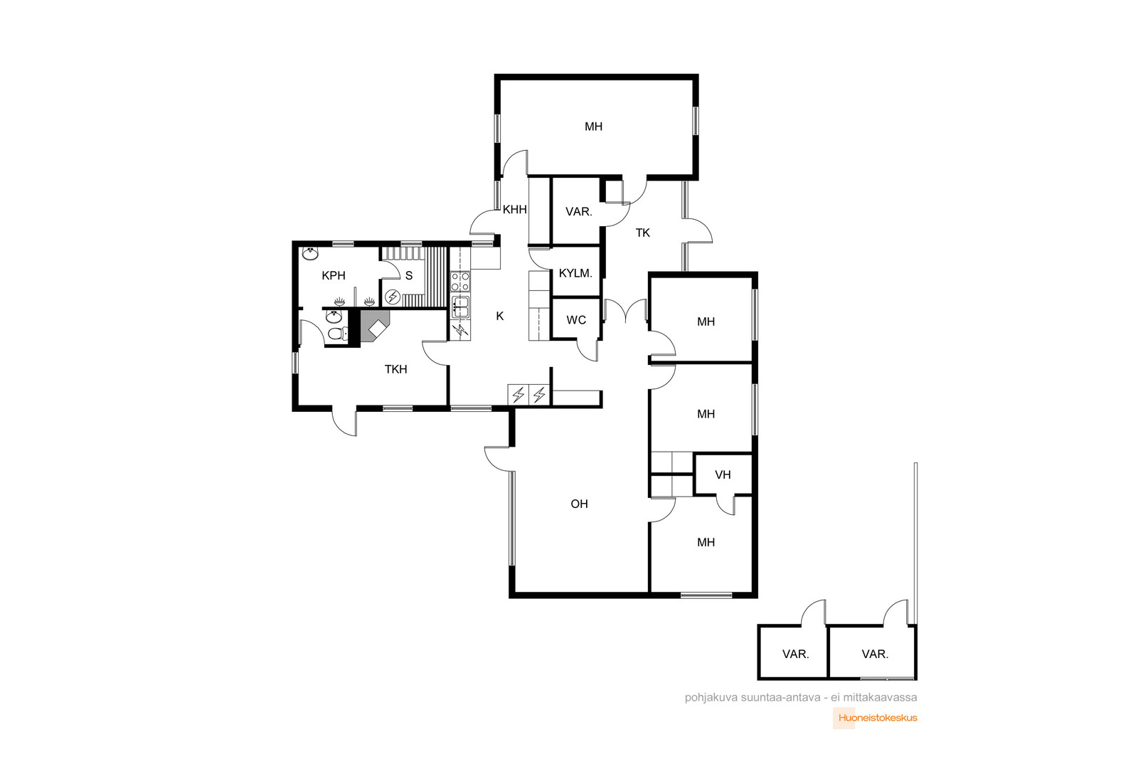 - Asuintilat yhteensä 140,35 m², joihin on luettu 4 makuuhuonetta, olohuone, keittiö, 2 wc ja kylpyhuone, sauna, pesuhuone ja pukeutumishuone. Muut tilat yhteensä 20 m², joihin on luettu varastotilat autokatoksen yhteydessä sekä pihassa. Asuinrakennuksen asuinpinta-ala on rakennuspiirustusten mukaan 140,35 m². Edellä mainittu pinta-ala saattaa tämän ikäisessä kohteessa poiketa olennaisestikin asuinrakennusten nykyisten mittaustapojen ja standardien mukaan laskettavasta asuintilojen pinta-alasta. Asuinrakennuksen todellinen asuinpinta-ala voi siis olla esitteessä mainittua pienempi tai suurempi.
