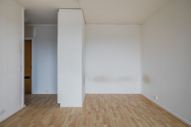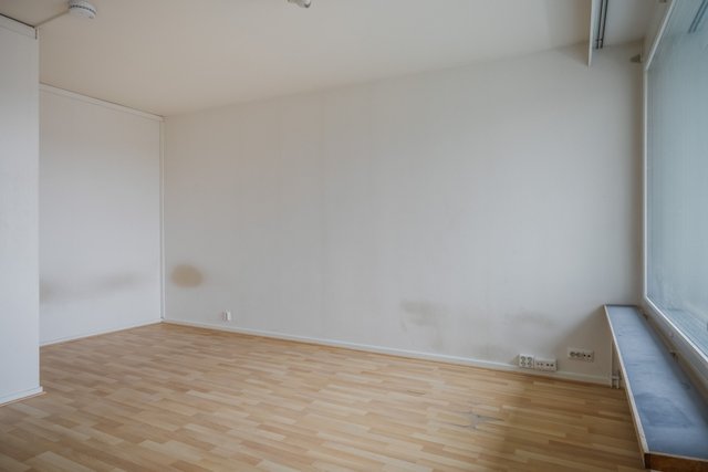- Valoisa kokonaisuus, lisäksi alkovi. Laminaattilattiassa ikkunan edessä korjattava kohta.