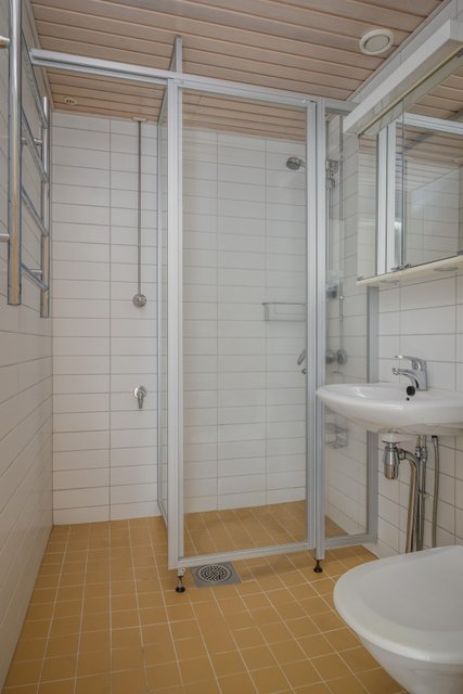 - Suihku, suihkuseinä, peilikaappi, pesuallas, wc-istuin, bidee-suihku, pesukoneliitäntä, lattialämmitys, ja kuivauspatteri