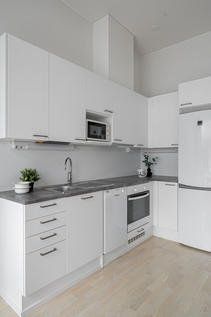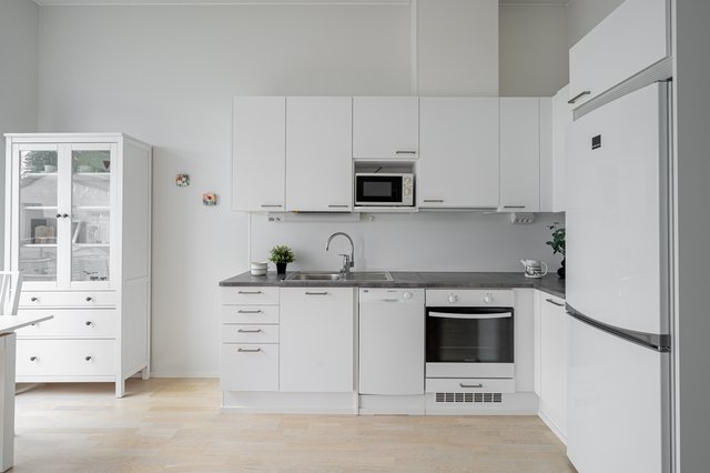 - Jääkaappipakastin, uuni, astianpesukone, liesituuletin, ja liesi