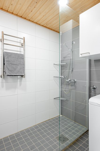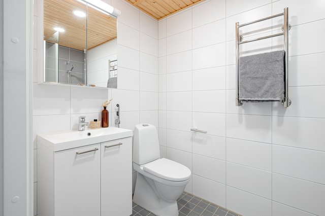 - Suihku, suihkuseinä, wc-istuin, peilikaappi, allaskaappi, pyyhekuivain, ja pesukoneliitäntä