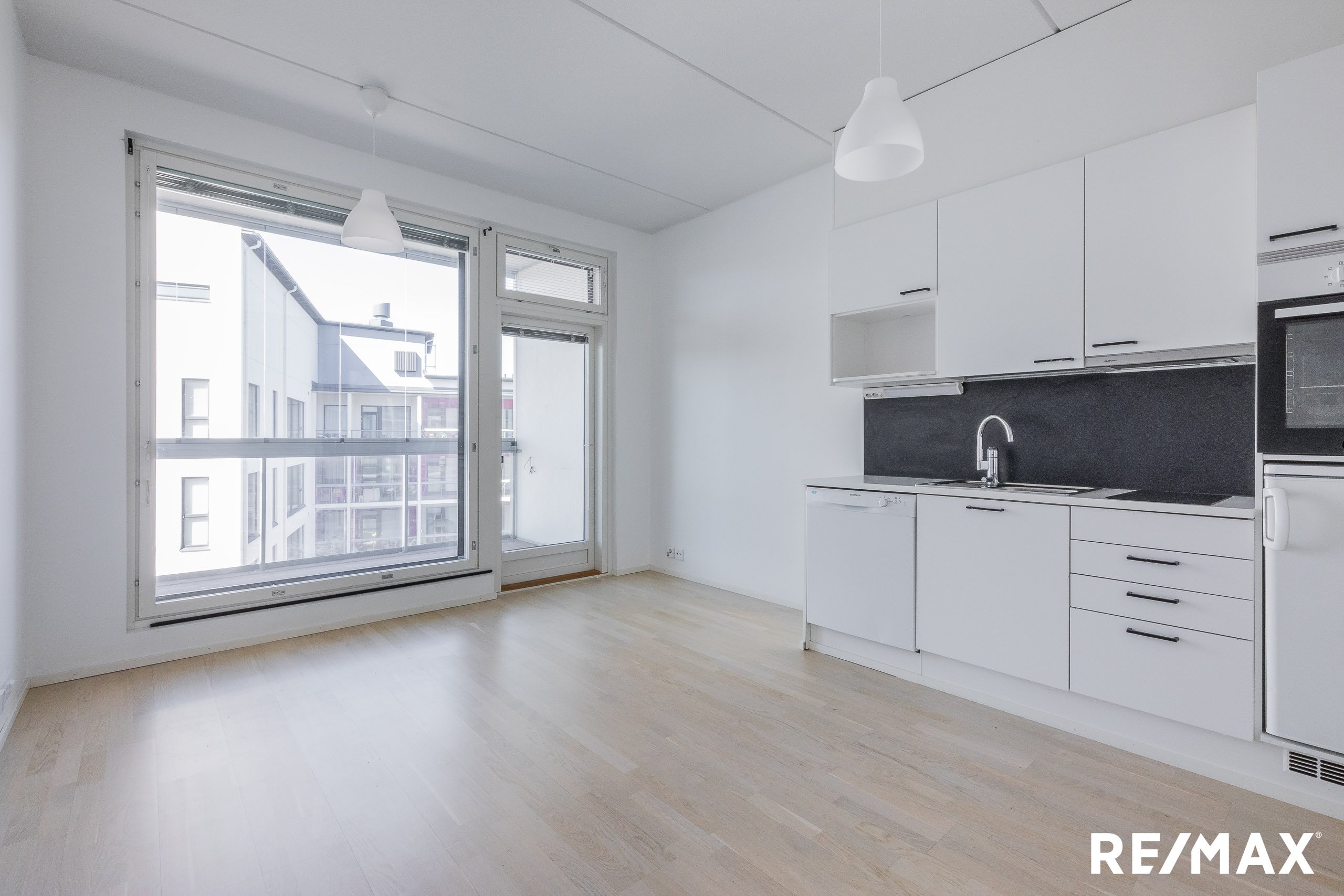 Hyvin varusteltu keittotila joka on yhdistetty asuinhuoneeseen. Asunnon kylpyhuone on erittäin tilava ja pesukoneelle löytyy myös paikka. Tämän kokonaisuuden täydentää tilava, länsi suuntaan sijaitseva asunnon levyinen lasitettu parveke, josta näkymät sisäpihalle ja rakenteilla olevaan urheilipuistoon.
