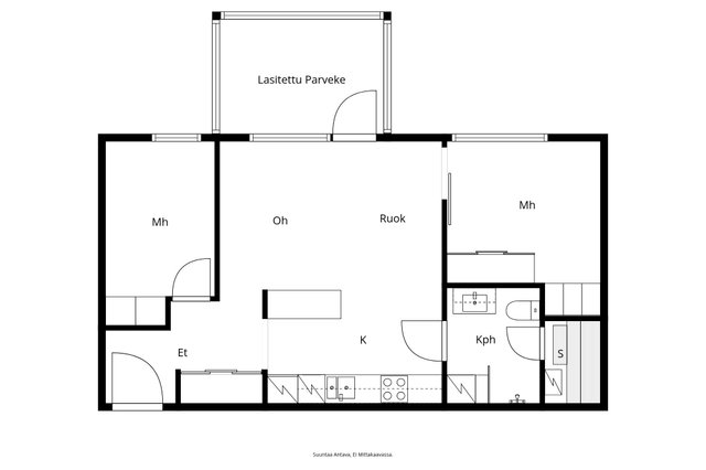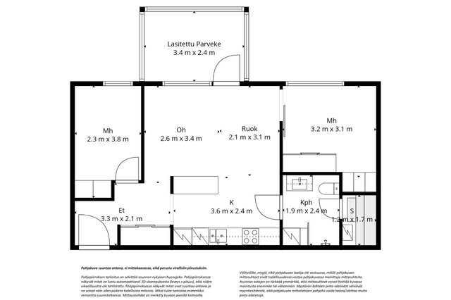 - Kohteen markkinoinnissa käytetään mittatiedoilla varustettua pohjapiirrosta. Pohjapiirroksen tarkoitus on helpottaa ostajan ostopäätöstä ja selvittää asunnon nykyinen huonejako. Lukija on tietoinen, että pohjakuva on suuntaa antava, ei mittakaavassa, eikä perustu virallisiin piirustuksiin. Pohjapiirroksessa näkyvät mitat on luotu automaattisesti 3D-skannauksesta (leveys x pituus), eikä niiden oikeellisuutta ole tarkistettu. Pohjapiirroksessa näkyvät mitat ovat suuntaa antavia ja ne voivat näin ollen poiketa todellisista mitoista. Mitat tulee tarkistaa esimerkiksi remonttia suunniteltaessa. Mittauskohdat on merkitty kuvaan pienillä kolmioilla. Välitysliike, myyjä, eikä pohjakuvan laatija ole vastuussa, mikäli pohjakuvan mittasuhteet eivät todellisuudessa vastaa pohjakuvassa mainittuja mittasuhteita. Lukijan on tärkeää ymmärtää, että mittasuhteet voivat heittää kuvassa mainitusta enemmän tai vähemmän. Myytävän kohteen pinta-alatiedot selviävät myyntiesitteestä, eikä pohjakuvan mittatietojen pohjalta voida laskea/olettaa muita pinta-alatietoja.
