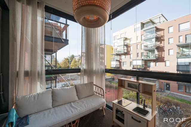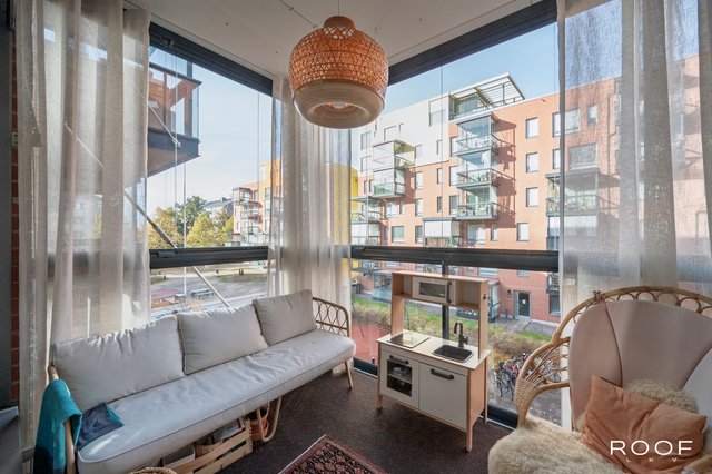 Lasitettu parveke jatkaa oleskelutiloja ja tarjoaa viihtyisän lisähuoneen keväästä pitkälle syksyyn.