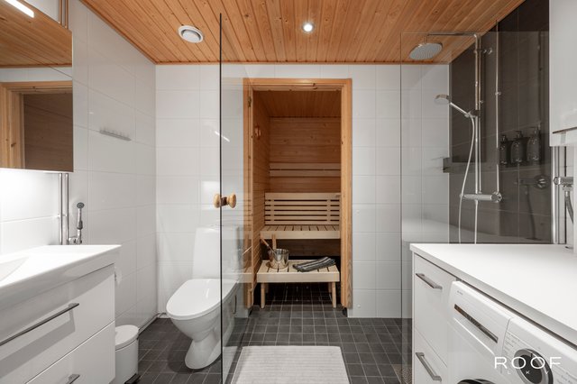 - Varustus: Suihku, Suihkuseinä, Wc istuin, Pesukoneliitäntä, Hana, Allas, Peilikaappi, Allaskaapisto, Lattialämmitys, Säilytyskaluste, taso & yläkaappi lisätty 2023 Seinämateriaali: Laatta Lattiamateriaali: Laatta