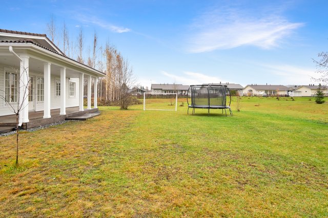 - Ajoväylä kivituhkalla. Kulkuväylä laatoitettu ja muutamia istutusaltaita piha-alueella. Marjapensaita autotallin takana.