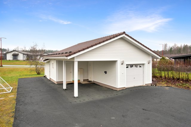 - Talousrakennus joka käsittää autotallin (lämpöeristetty, sähköinen ll. ja ilp), autokatoksen, lämpimän varaston sekä takaa löytyvän kylmän varastotilan samassa yhteydessä.