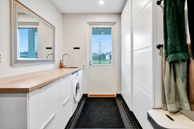 - Pesukoneliitäntä, lattialämmitys, pyykkikaapit, lattiakaivo, ja pöytätaso
