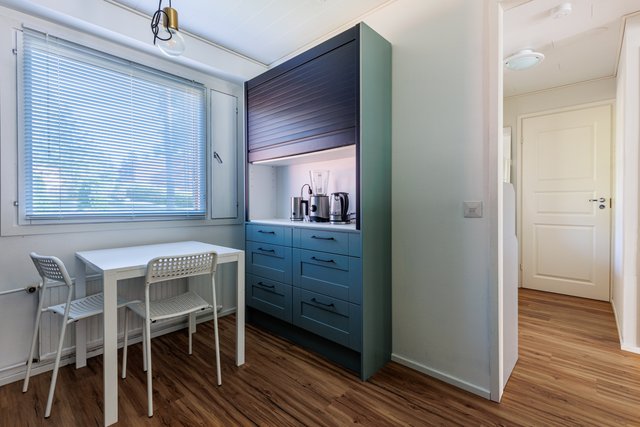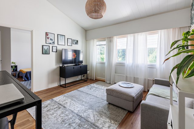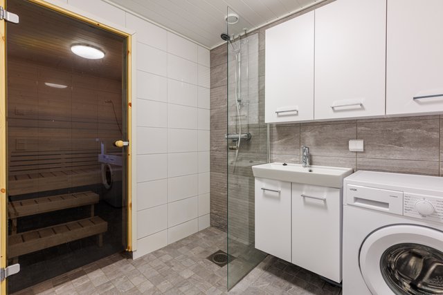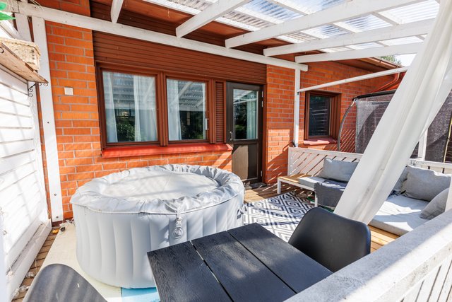 Asunnon sauna ja kylpyhuone ovat saaneet uuden ilmeen vuonna 2023, joten voit nauttia rentouttavista saunahetkistä ilman huolta remonttitarpeista. Katettu terassi tarjoaa mukavan paikan nauttia ulkoilmasta.