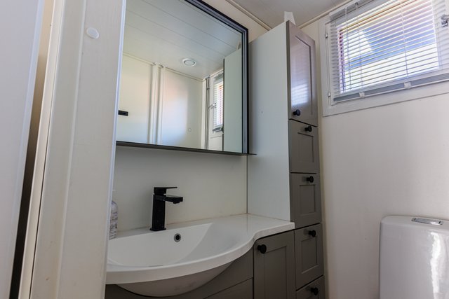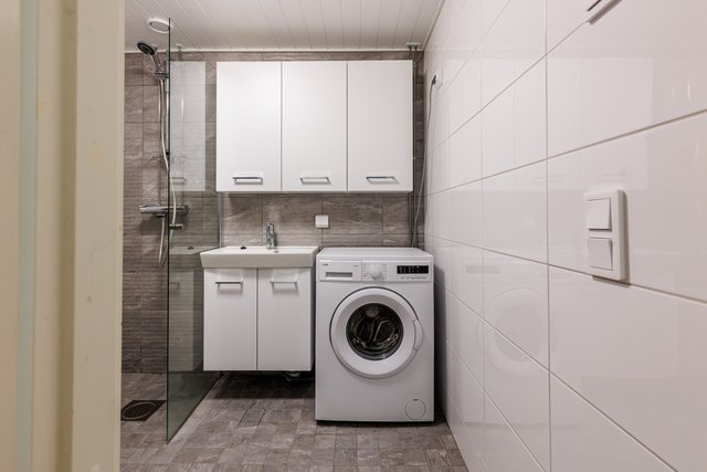 - Pesukoneliitäntä, peilikaappi, ja pesuallas