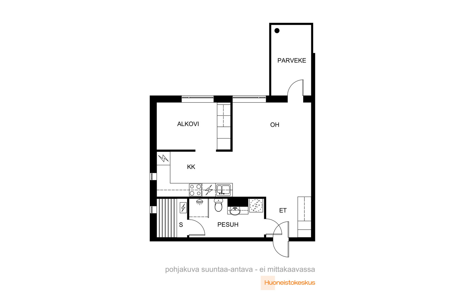 - WC-istuin, pesukoneliitäntä, suihku, peilikaappi, ja kiinteät valaisimet