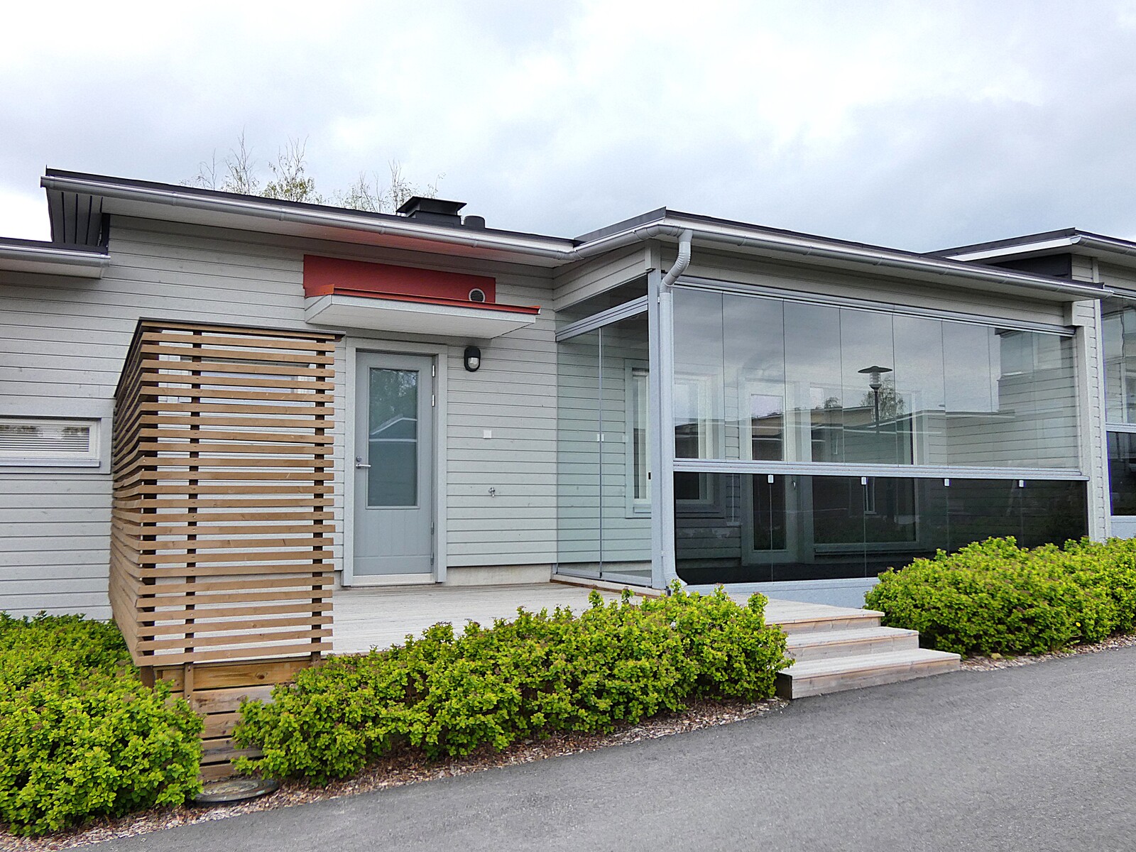 Tämä koti on yhdessä tasossa. Valoisat olohuone ja keittiö ovat nykypäiväisesti yhtenäistä ja toimivaa tilaa. Kaksi makuuhuonetta on varustettu hyvillä säilytyskaapistoilla ja toisen makuuhuoneen yhteydessä on myös vaatehuone. Asunnossa on kaksi wc:tä, toinen pesuhuoneen yhteydessä. Lisäksi asunnossa on tietenkin oma sauna. Arkea helpottava kodinhoitohuone on tilava ja sieltä on käynti suoraan terassille. Ulkoterassin lisäksi löytyy myös lasitettu terassi.