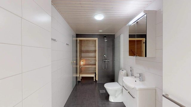 - WC-istuin, suihku, pesukoneliitäntä, peilikaappi, pesuallas, allaskaappi, bidee-suihku, ja suihkuseinä