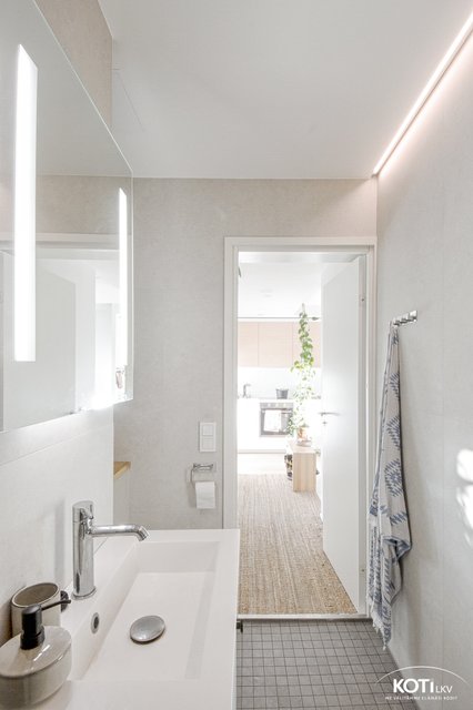 - WC-istuin (seinä-wc), suihku, suihkuseinä, pesukoneliitäntä, pesuallas, allaskaappi (Otsoson vedenkestävä massiivilaminaattikaluste), ja peili