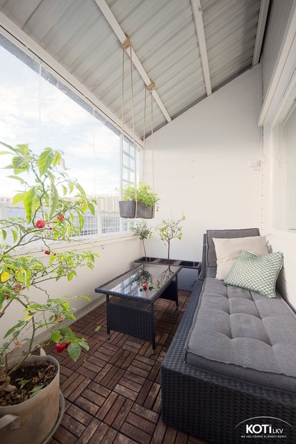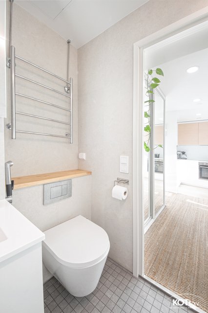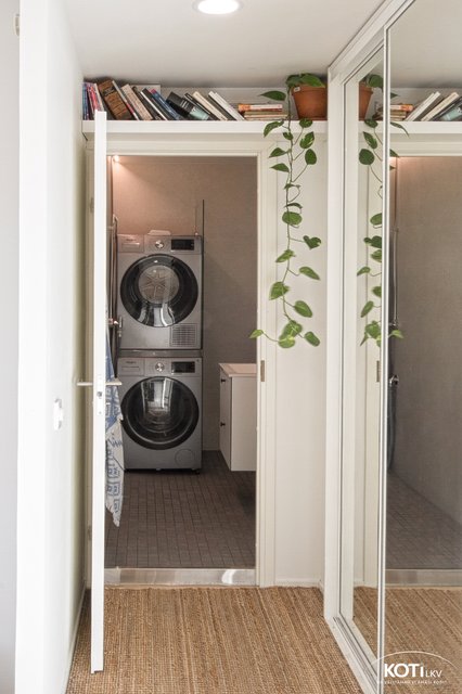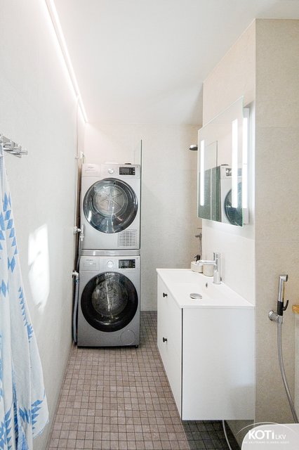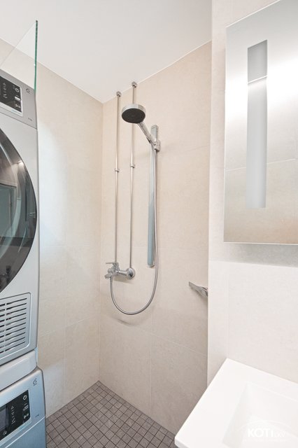 Pohjaratkaisu on todella hyvä ja toimiva. Kylpyhuoneeseen mahtuu myös pyykkitorni. Lasitettu tilava parveke katunäkymin.