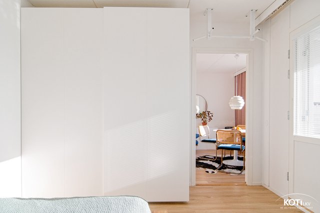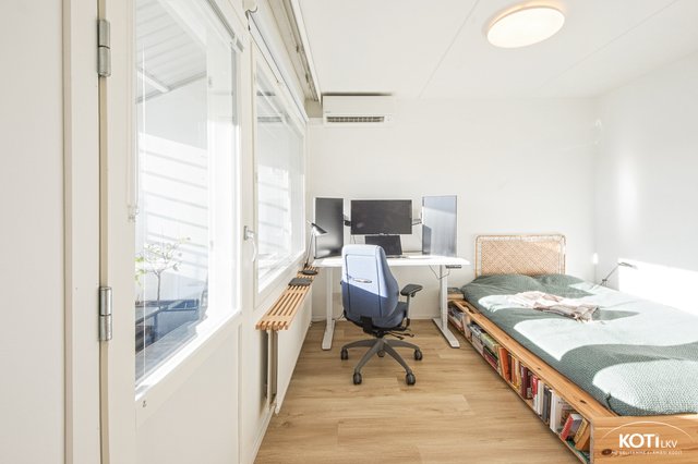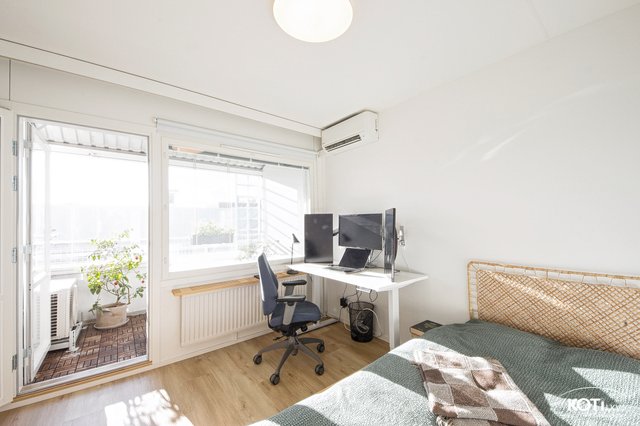 - Yksi makuuhuone, liukuovikaapisto. Makuuhuoneesta käynti tilavalle lasitetulle parvekkeelle. Makuuhuoneessa ilmalämpöpumppu, toimii koko huoneiston viilennykseen.