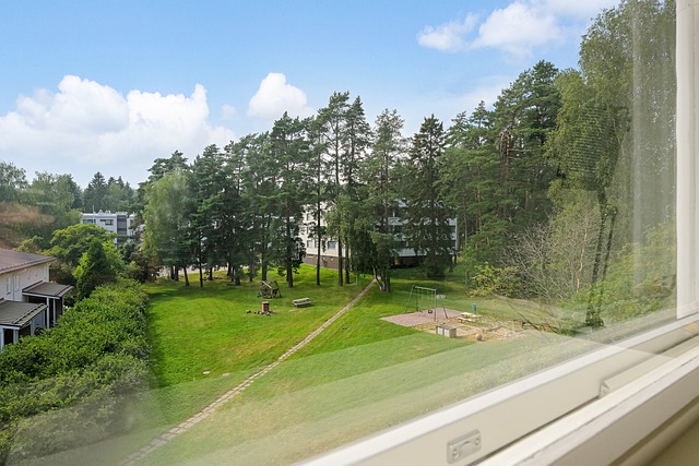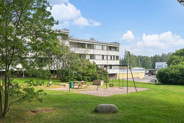 - Näkymä puistomaiselle yhteispihalle, istutuksia, puita, lasten leikkialue ja matalampia lähitaloja.
