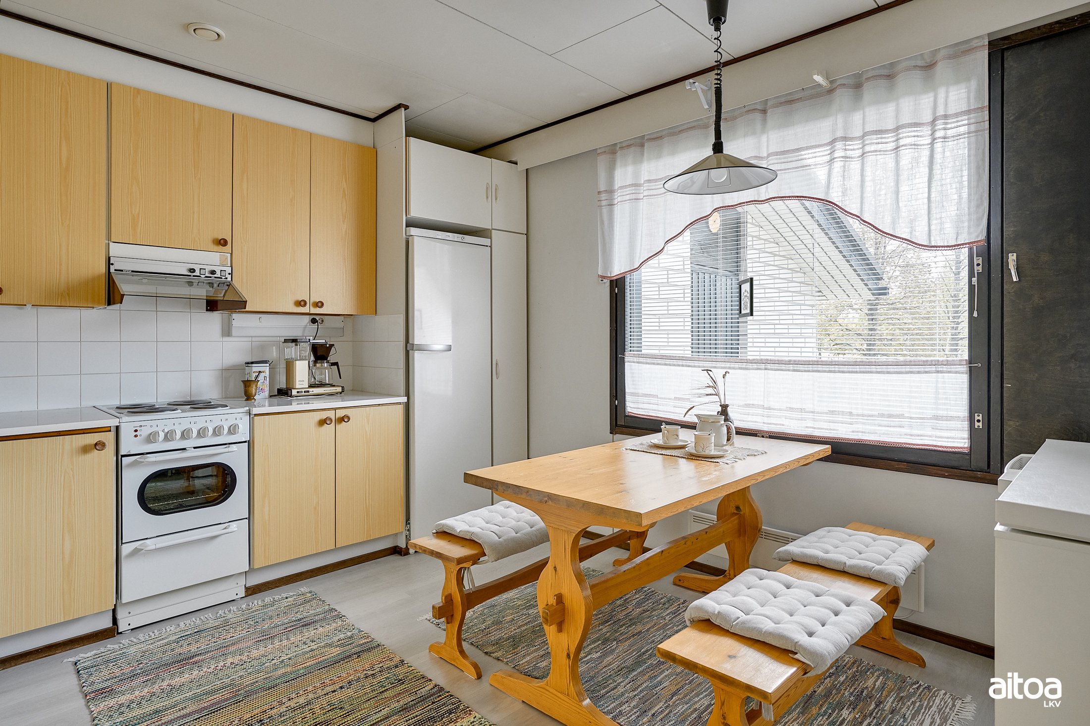 - Jääkaappi, arkkupakastin, liesituuletin, valurautaliesi, astianpesukone, mikroaaltouuni, kahvinkeitin, vedenkeitin, leivänpaahdin.