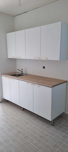 - Pesuallas, lattiakaivo, lattialämmitys, pesukoneliitäntä, pöytätaso, ja pyykkikaapit