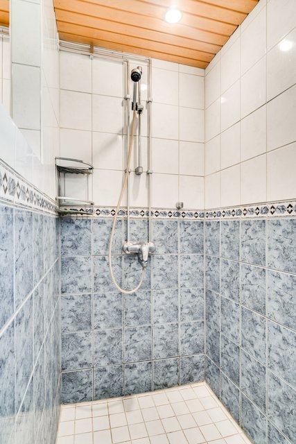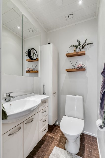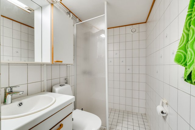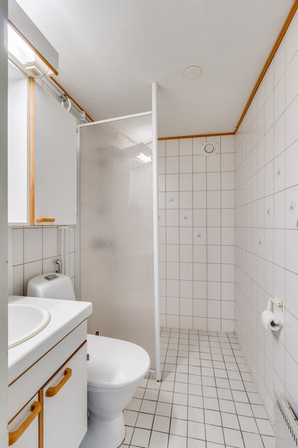 - Alakerran kylpyhuone/wc, jossa suihkukaappi. Tämä on kokonaan laatoitettu.